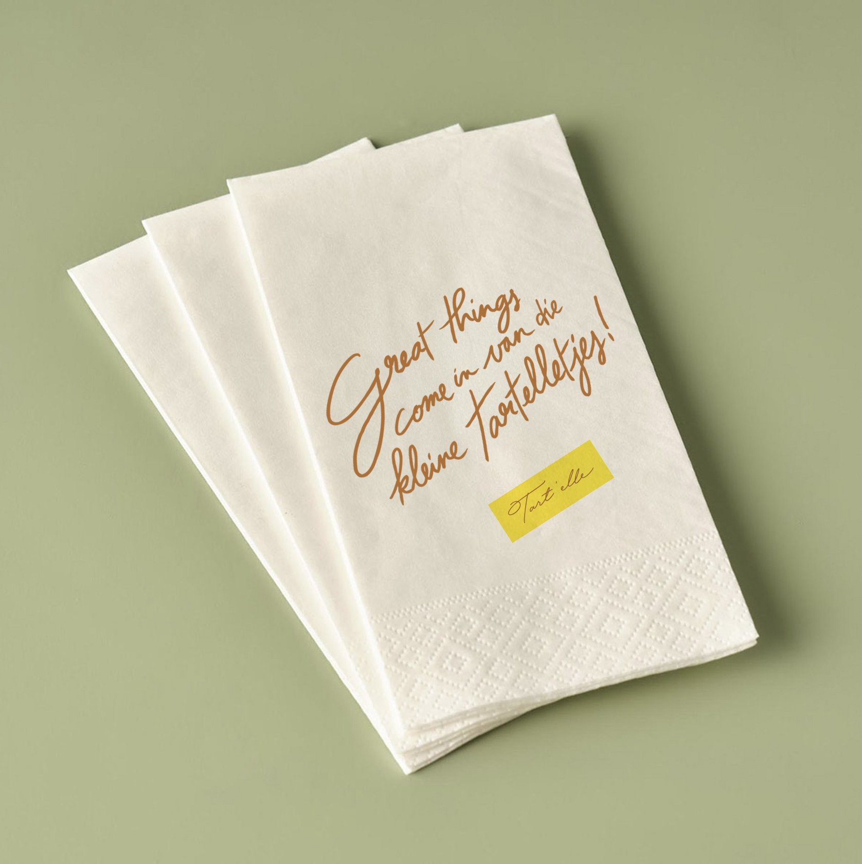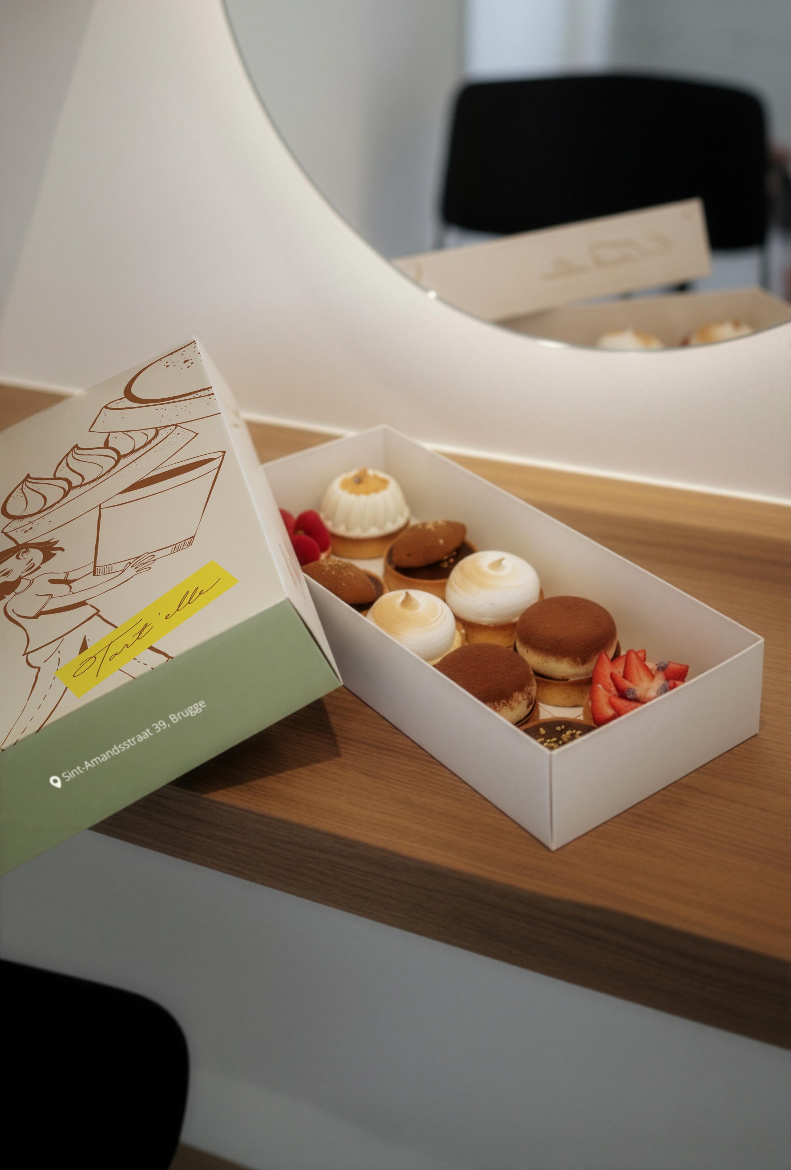 Van deurbelettering tot packaging, van naamkaartjes tot servetten, van cadeaubonnen tot T-shirts: alles vormt één zoet merkverhaal.