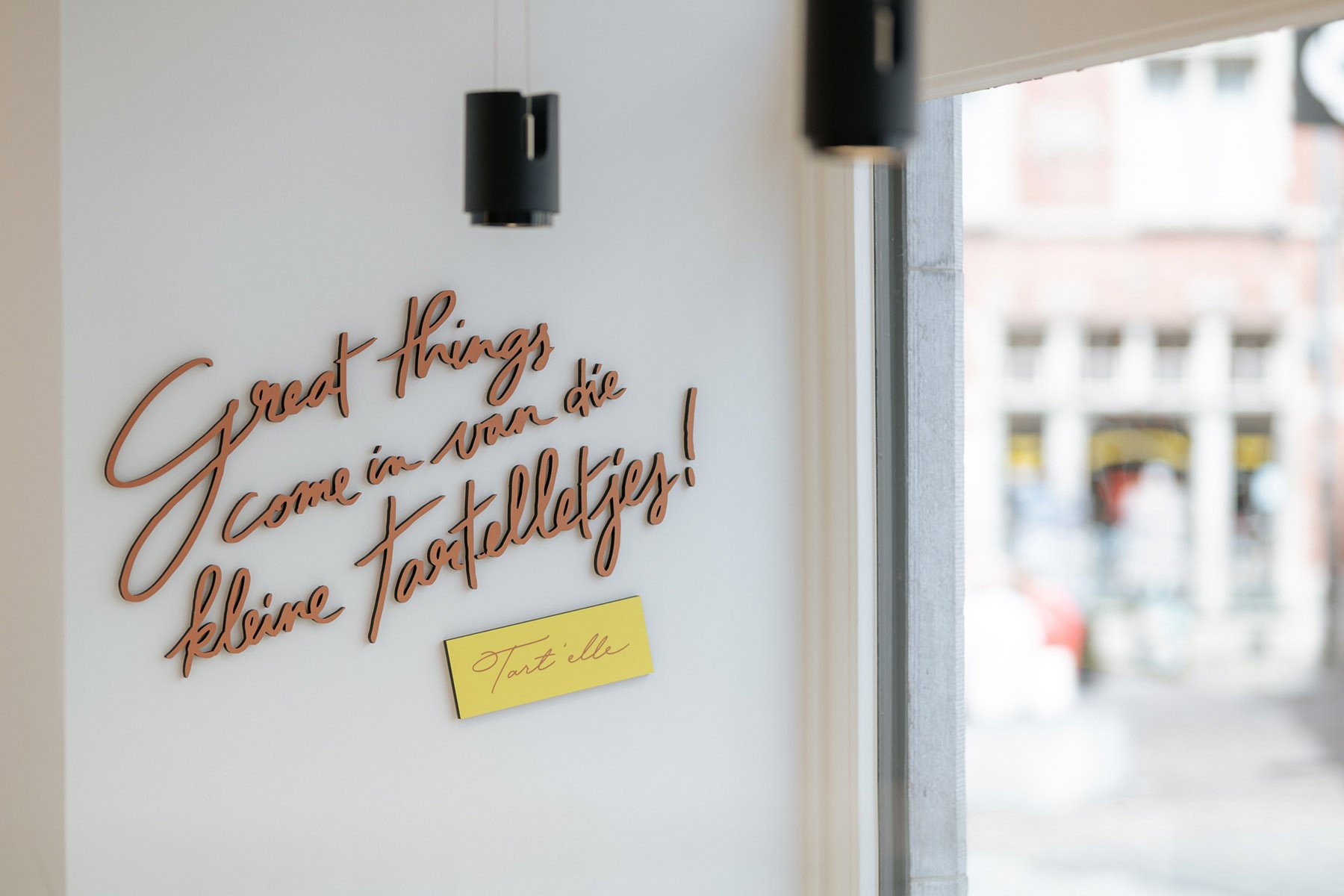 Tart’elles signature? Kleine taartjes die heerlijk smaken, maar ook een pure streling voor het oog zijn. En die lijn wilden we doortrekken in het winkelconcept. De interieurvormgeving was al in ontwikkeling, aan ons om na te denken over de communicatiedragers.