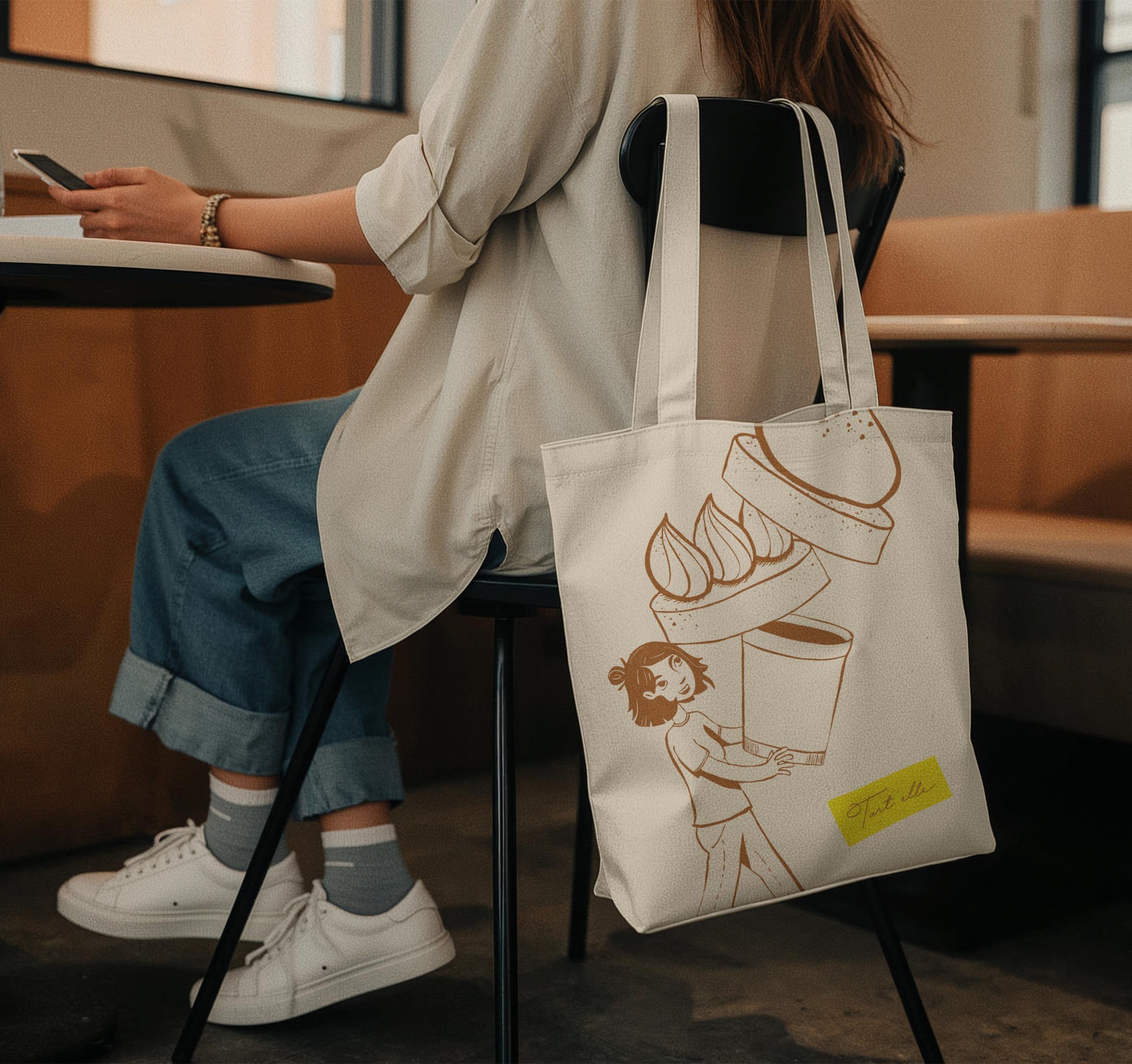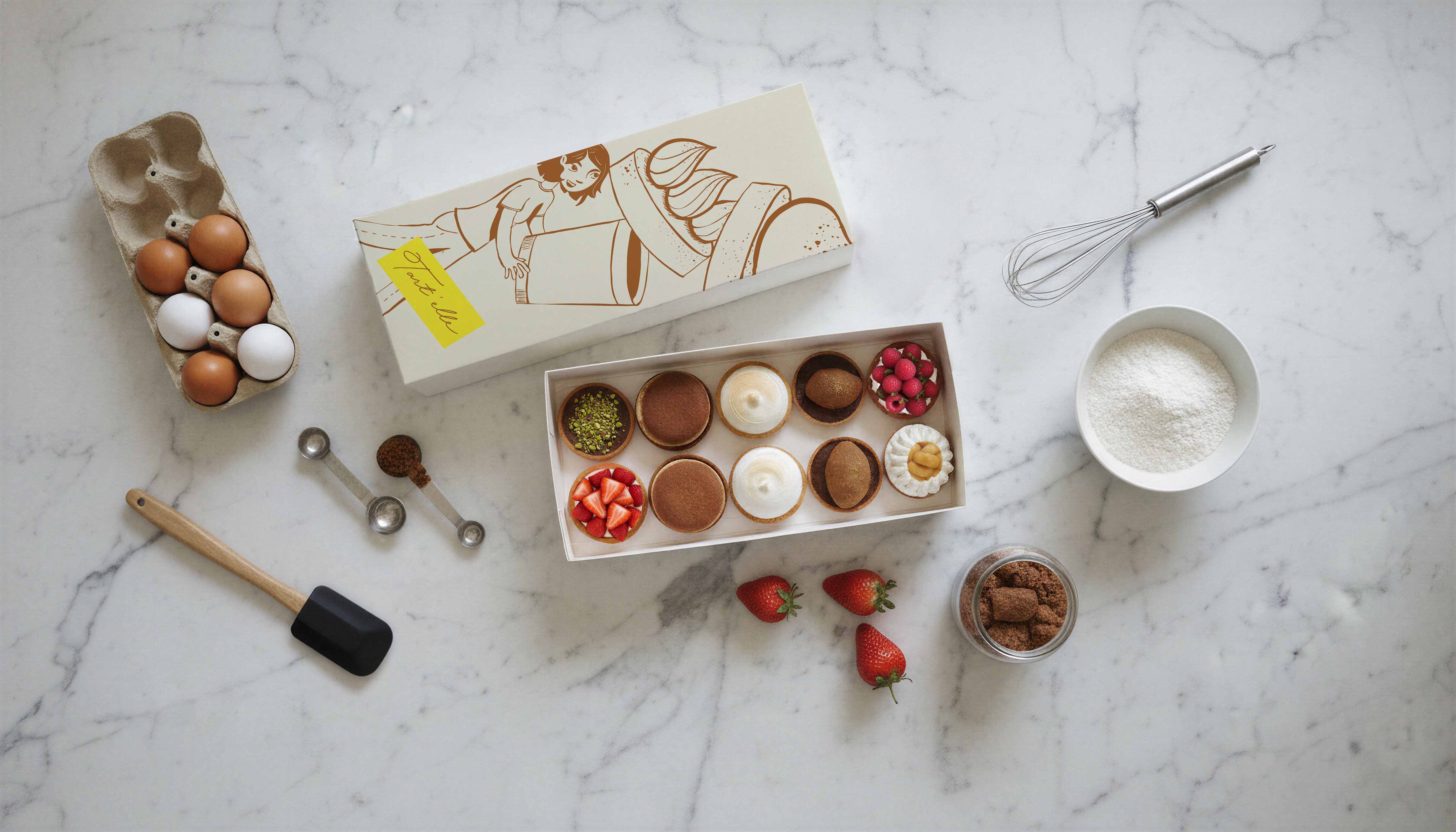 We creëerden ook een eigen illustratie voor Tart’elle, waarbij over elk detail goed nagedacht werd. Het figuurtje weerspiegelt het ‘on the go’-principe en het ambacht van de prachtige taartjes.