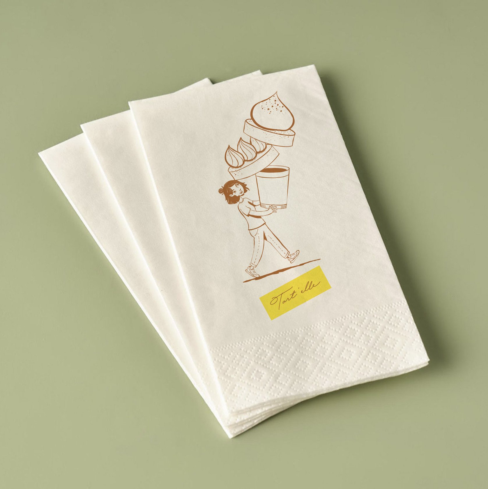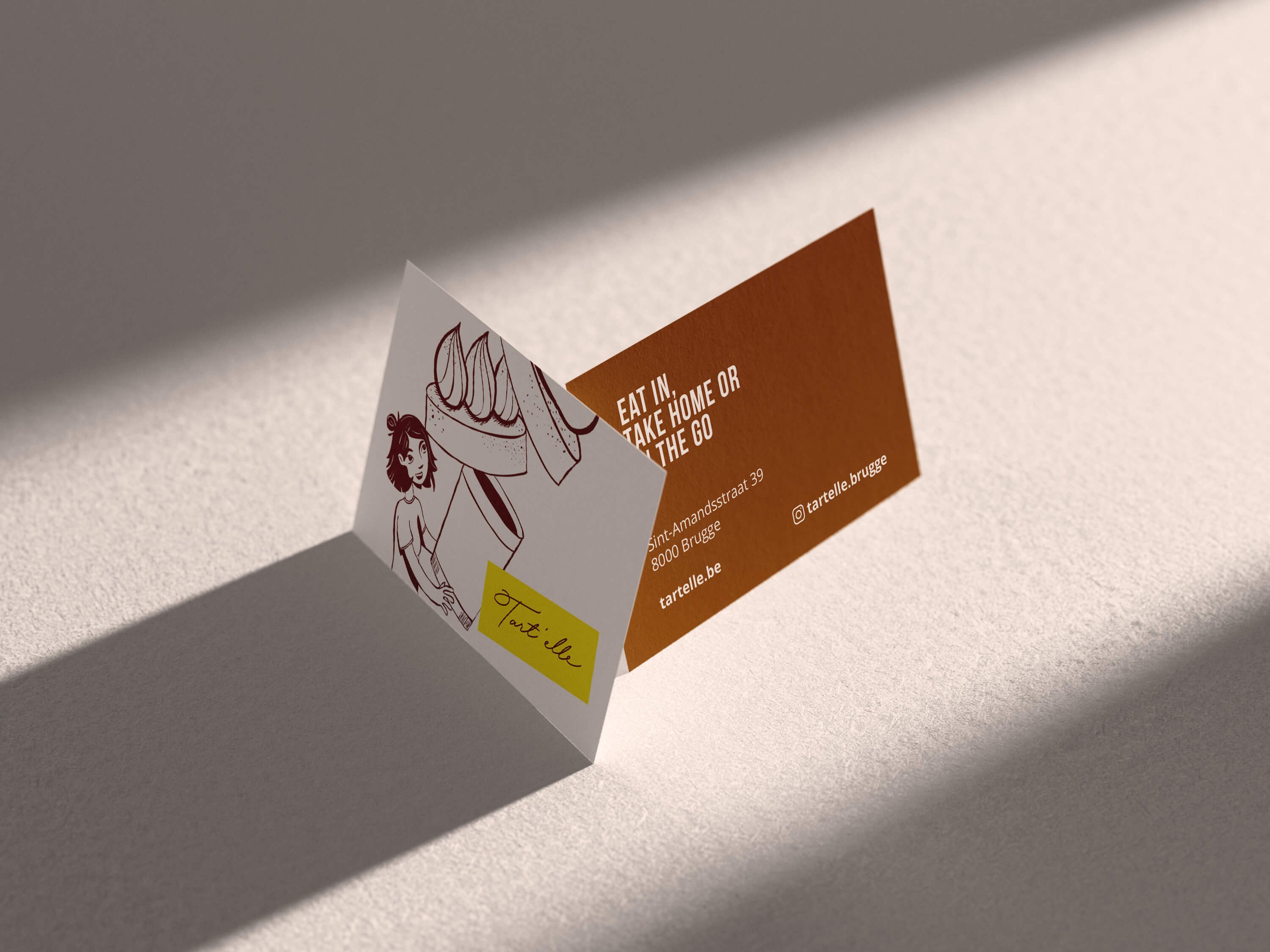 We creëerden ook een eigen illustratie voor Tart’elle, waarbij over elk detail goed nagedacht werd. Het figuurtje weerspiegelt het ‘on the go’-principe en het ambacht van de prachtige taartjes.